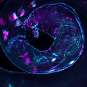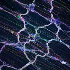 Fluorescently labelled neurons in the adult mouse gut, where each colour labels an individual type of neuron and its projections, giving each a unique signature. The connections between them, the ganglia, can be found at the junction of these tracts. Collectively this network of cells forms the enteric nervous system.