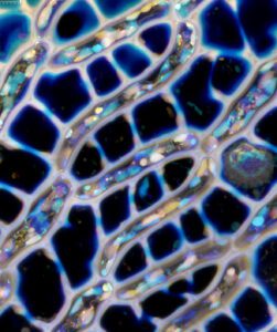 Laser Scanning Confocal z-series of Sphagnum moss leaves presented as a colour-coded projection by depth to emphasise the large retort cells that allow the leaves to retain 20 times their dry weight in water. Sphagnum moss decays slowly to produce peat bogs, important habitats worldwide and a significant carbon store.